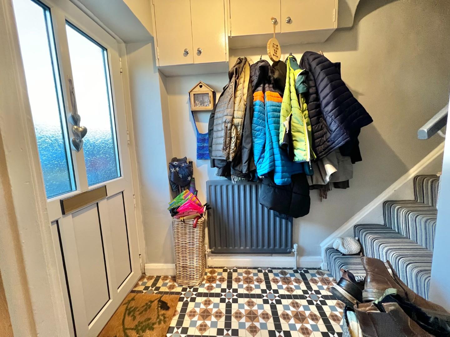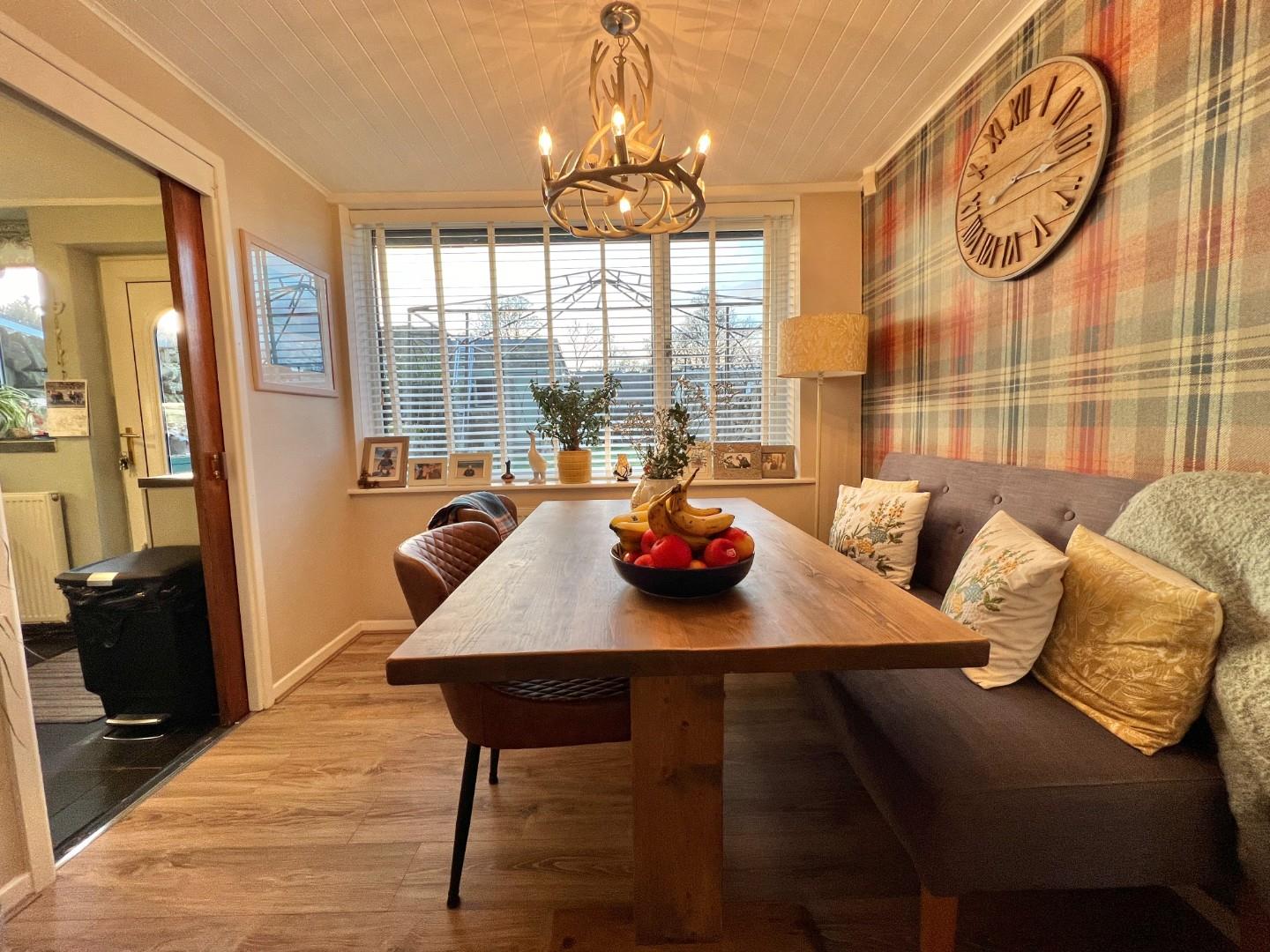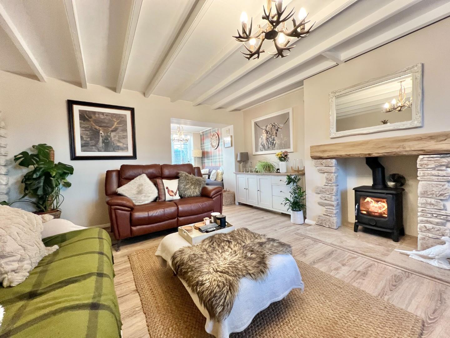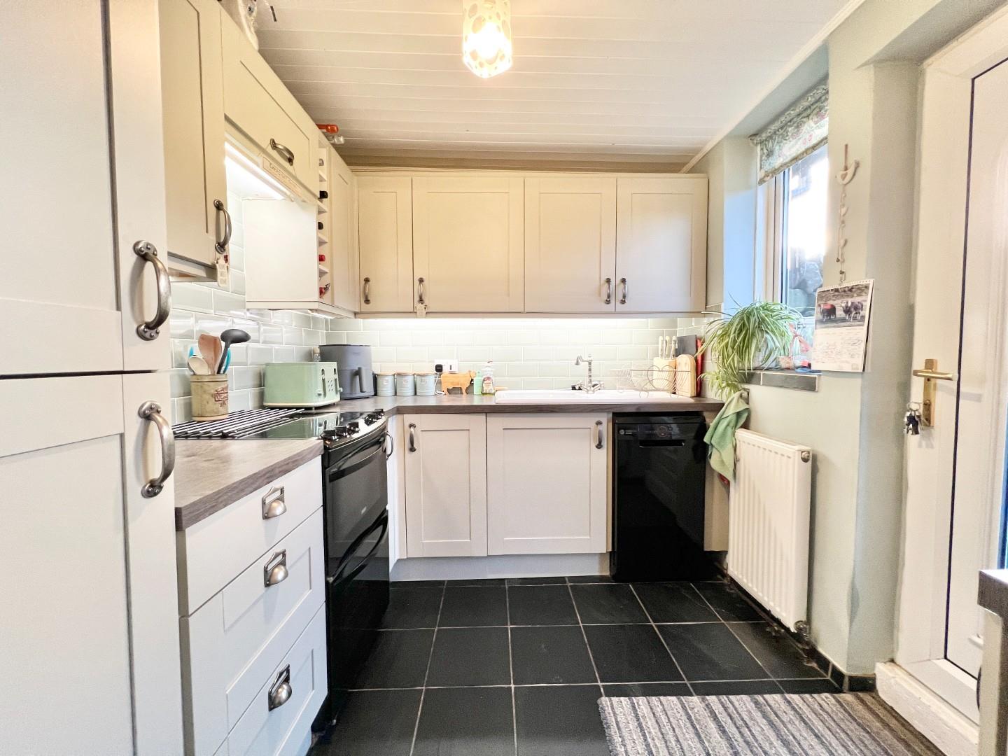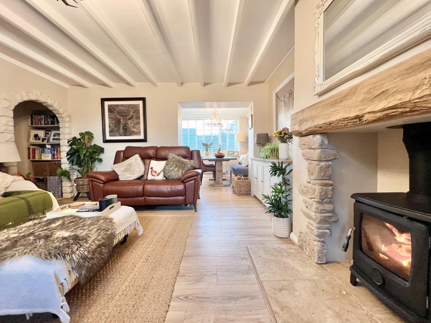 The internal accommodation comprises; entrance vestibule, lounge with log burning stove and under stairs storage space. Dining room with views over the rear garden and sliding door giving access to the kitchen which is fitted with a range of wall, base and drawer units with space for appliances.