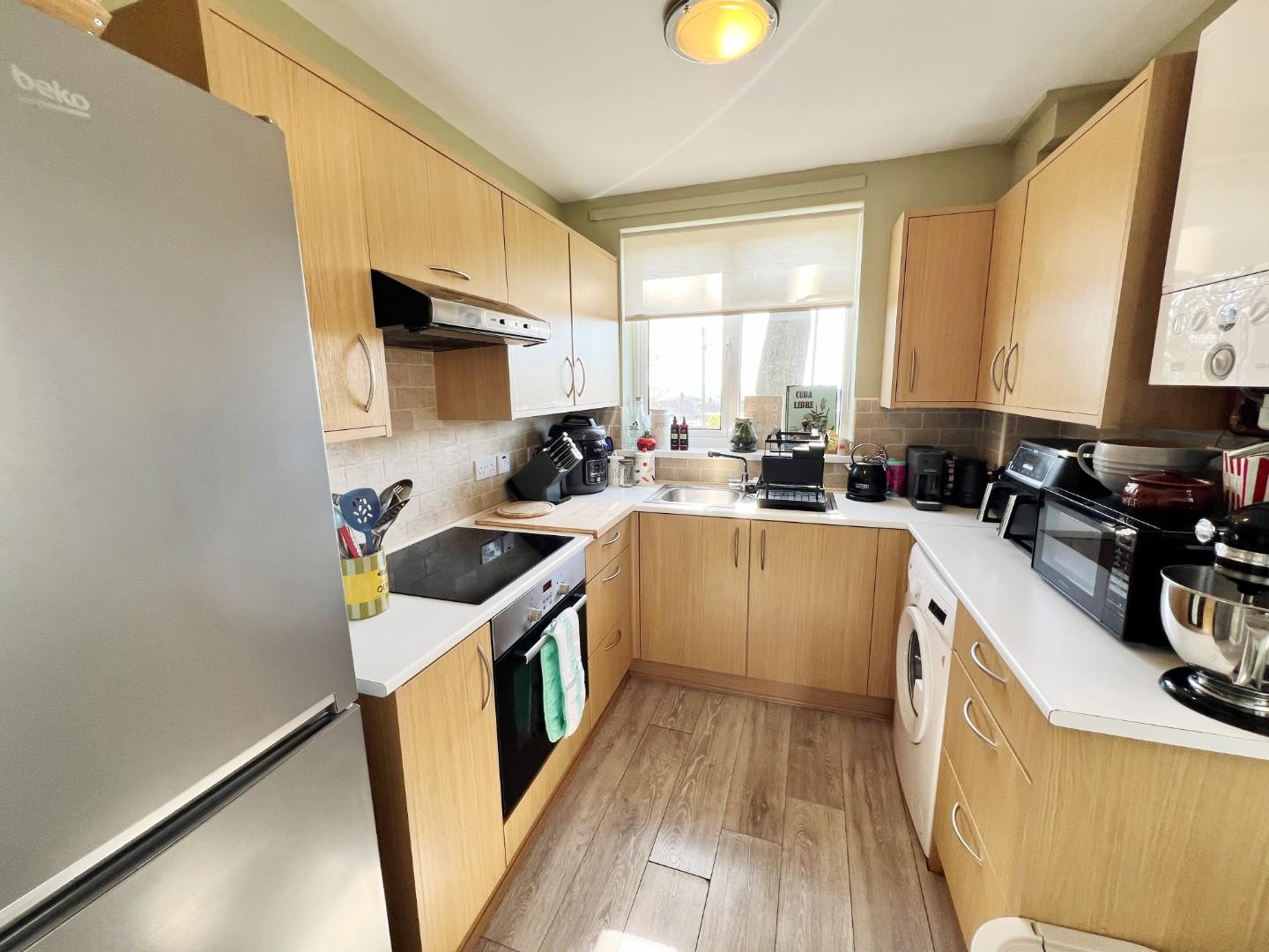 Wall and base units, stainless steel sink unit with mixer tap, tiled splashbacks, integrated oven, hob, extractor fan, plumbing for washing machine, space for fridge freezer, stylish flooring and uPVC window.