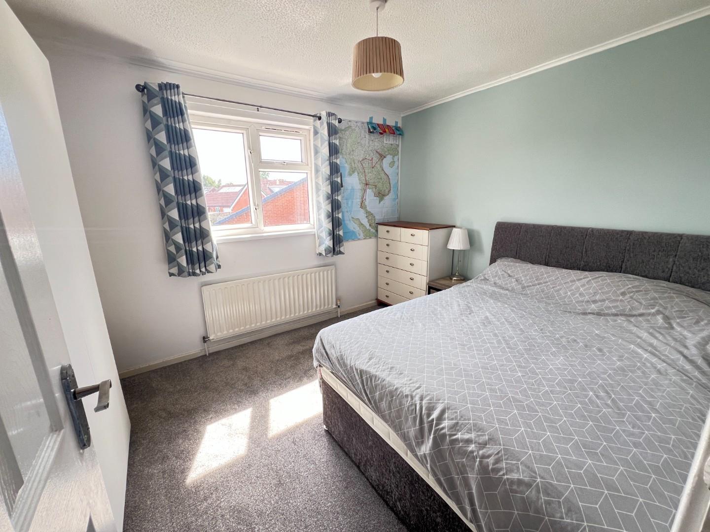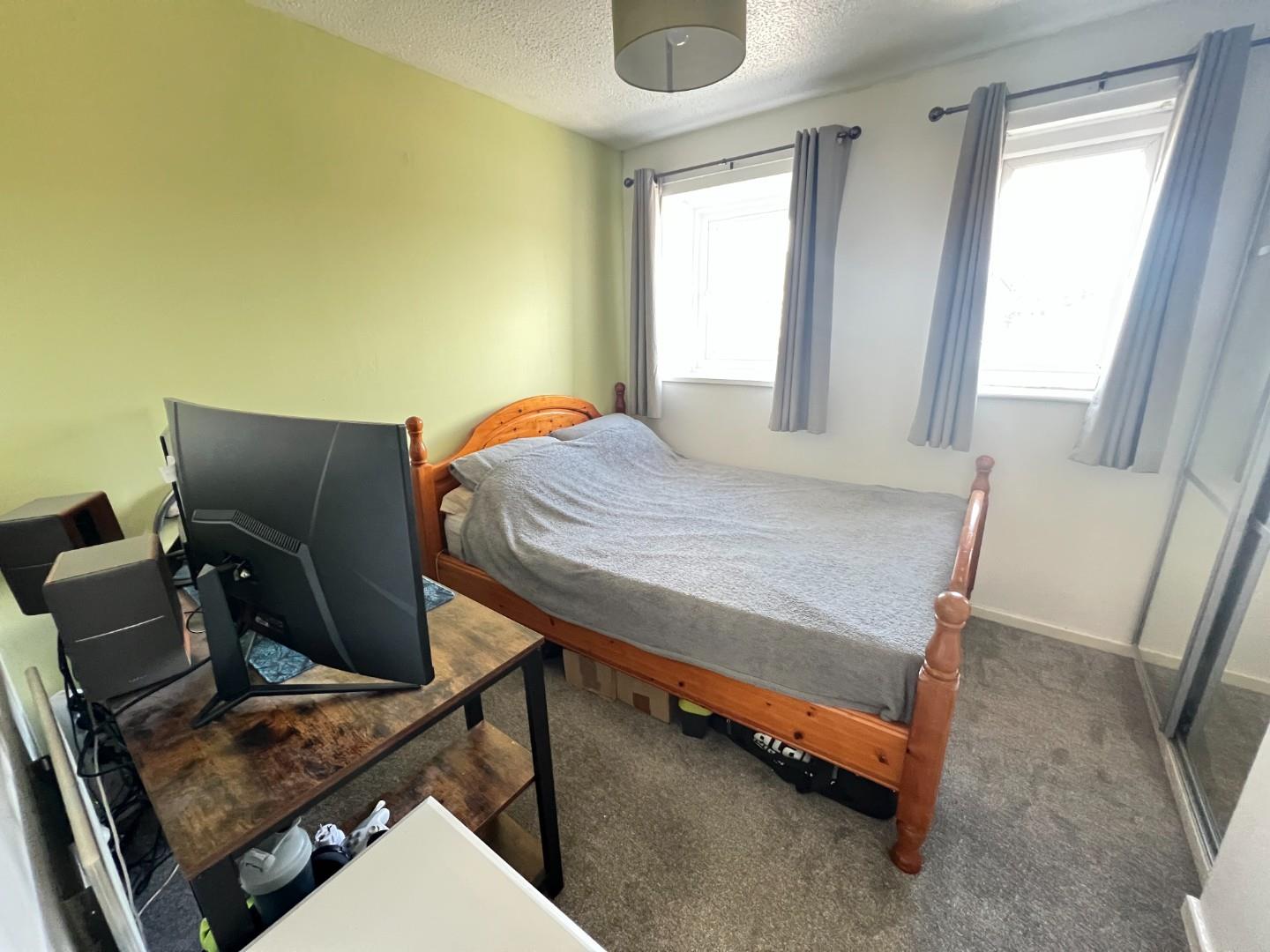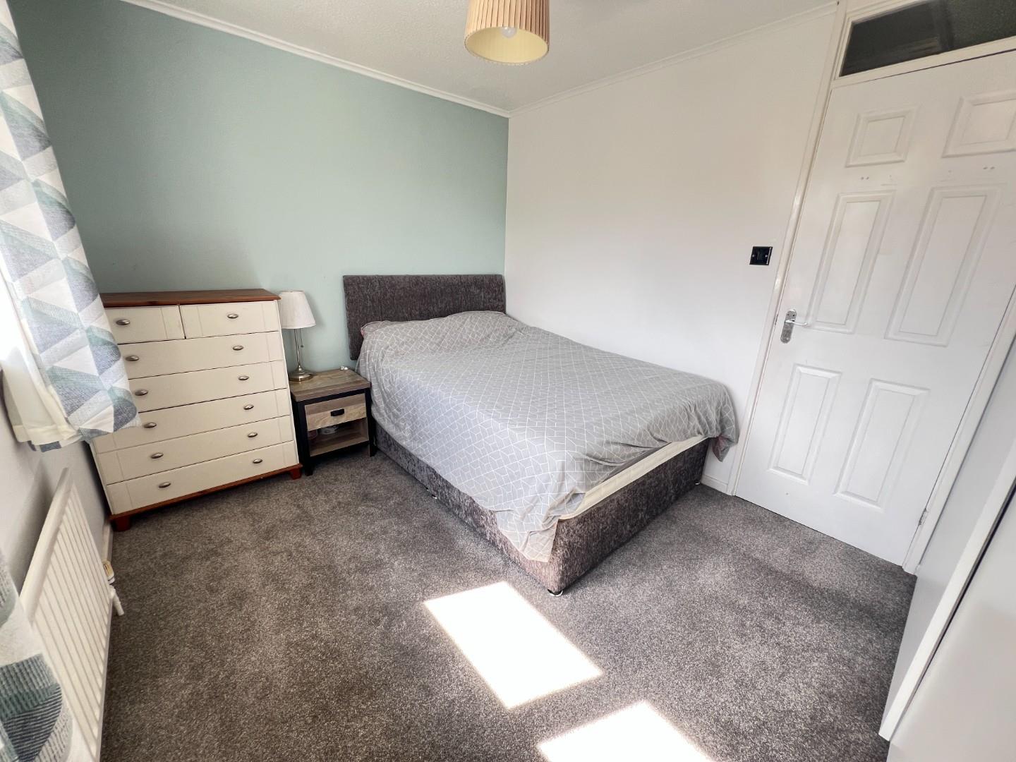 With built in wardrobes having mirrored sliding doors, over stair storage cupboard, television point and uPVC double glazed window to the front.