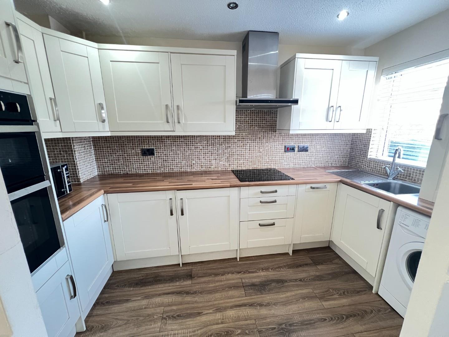 Fitted with a range of wall and base units with contrasting wood effect worktops incorporating single drainer stainless steel sink unit with mixer tap electric hob with extractor hood, eye level double oven. integrated fridge, freezer and dishwasher, tiled splashbacks, plumbing for and automatic washing machine, wall mounted gas central heating boiler and uPVC double glazed window to the front.