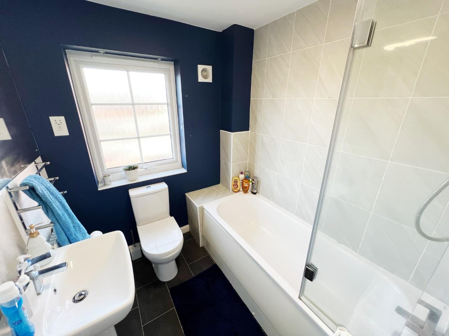 Fitted with a modern bathroom suite consisting of a low level WC, pedestal wash hand basin and bath with shower over, radiator, laminate tiled flooring, rear facing UPVC double glazed window.