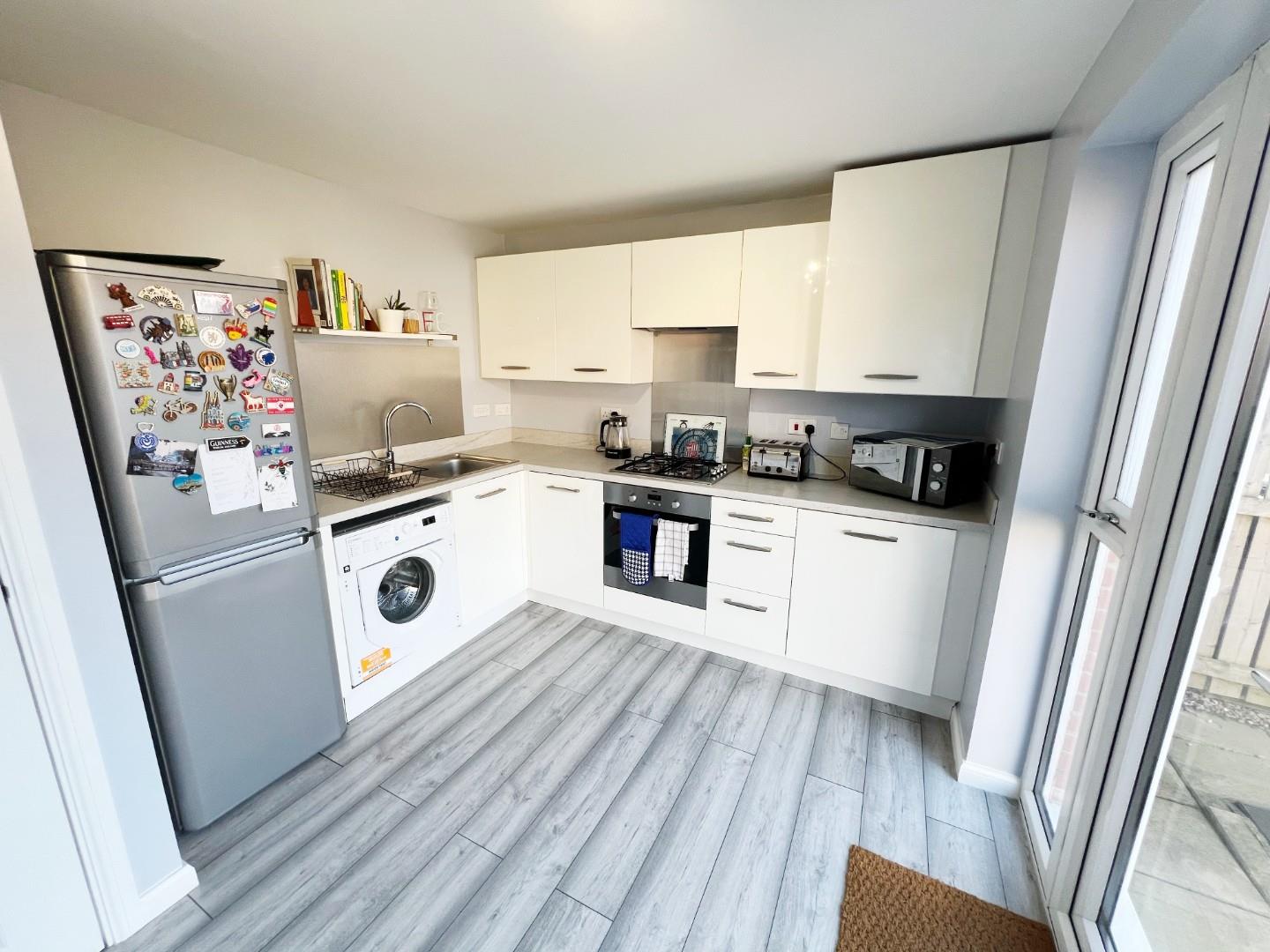 Fitted with a modern range of gloss fronted base, wall and drawer units, worktops inset with stainless steel sink and drainer, gas hob with illuminated extractor hood over, electric oven, Plumbed for washing machine, space for slimline dishwasher, additional added units, rear facing UPVC double glazed french doors with matching glazed side panels.